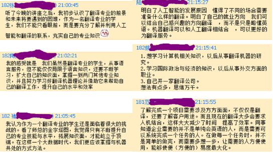 本次报告和交流于晚间8:30圆满结束,但是同学们,特别是于今年招收的我院首批翻译专业的同学们对专业和职业的思考因此而被激发,大家纷纷在专业QQ群里倾诉自己在报告学习和交流后的感想。热烈的讨论一直持续到深夜11:30。