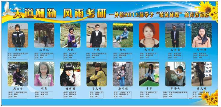 日前,2015年研究生录取结果已经揭晓,tyc8722太阳集团学子经过顽强拼搏,喜获佳绩,取得了历史性的突破。本次考试,学院共有27名同学达线,达线率为27%,其中,400分以上2人、380分以上9人,录取到南京大学、北京外国语大学、上海外国语大学、对外经济贸易大学、华东政法大学、东南大学、中山大学等国内知名985、211学校人数占录取学生数的81.39%。