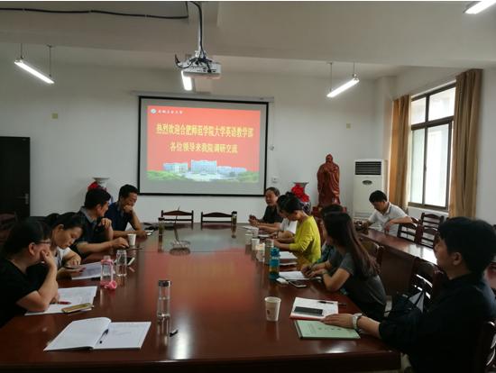 6月14日,合肥师范学院大学英语教学部主任曹军、主任助理张雪迟一行7人来我校调研交流本科教学审核评估和大学英语教学改革等工作。tyc8722太阳集团院长洪流主持交流会,大学英语教学部负责人等参加了座谈交流。