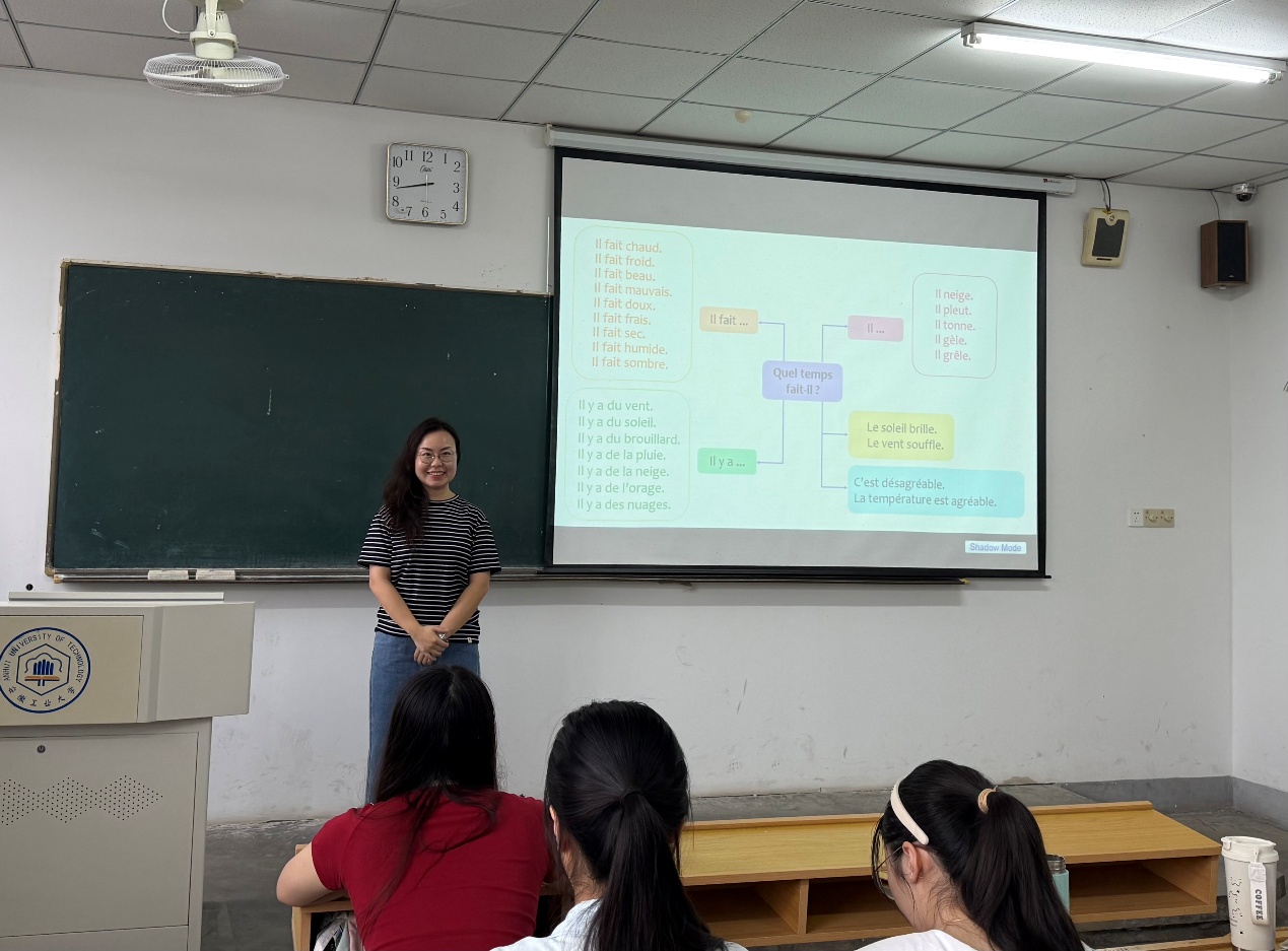 本次课程由青年教师吉玉婷主讲,她精心设计教学环节,在引导学生学习相关法语表达的同时,巧妙地将课堂话题引向对生态环境保护的思考。课程中,师生从描述四季景色过渡到探讨气候变化,并讨论如何从节约用水、绿色出行等身边事做起,以实际行动守护美丽的四季环境。