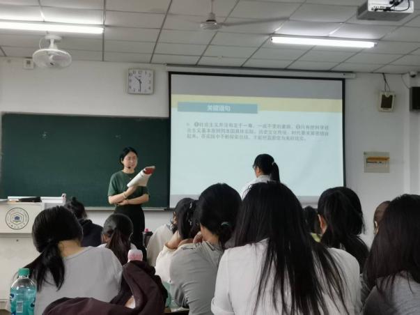 首先,赵萌菲老师从“核心词汇”入手,引导学生理解“中国式现代化道路”、“中国梦”、“两个一百年”奋斗目标等关键词的语义差异及翻译策略。她指出,这些词汇不仅体现中国特色话语体系的独特表达方式,也是展现中国话语国际传播力的关键节点。随后,赵萌菲带领学生深入研读若干关键语句,分析其中政治隐喻与文化内涵以及翻译策略。她指出,这些关键语句集中体现了新时代中国特色社会主义的总体任务与精神高度,翻译时既要准确传达逻辑结构,也要在语气与语义中体现中国道路的自信与包容。