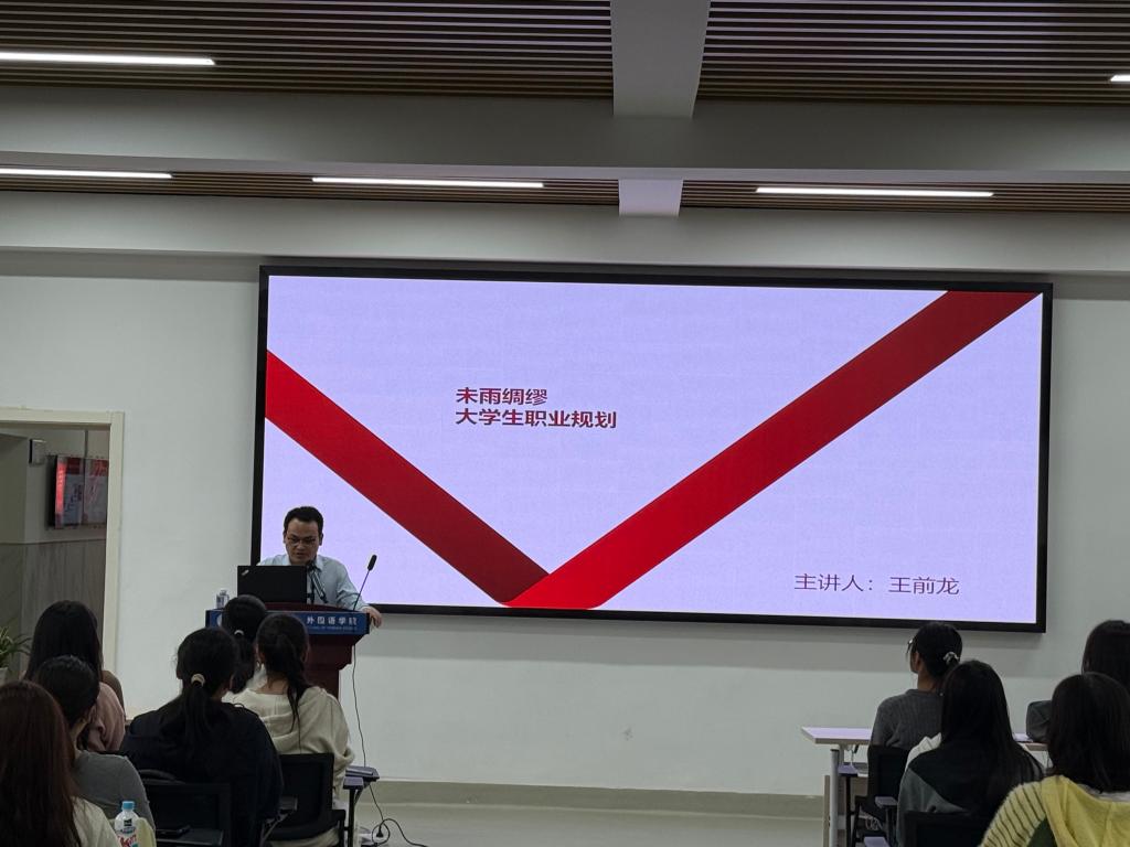 讲座现场气氛热烈,王前龙结合自身经历,从母校求学、初入职场到成长为行业骨干的奋斗历程,以生动详实的案例阐述了尽早进行职业规划的重要性。他围绕“如何认识自我与专业”“大学期间应储备哪些核心能力”“英语+”等关键议题,为新生们提供了系统而实用的指导。
