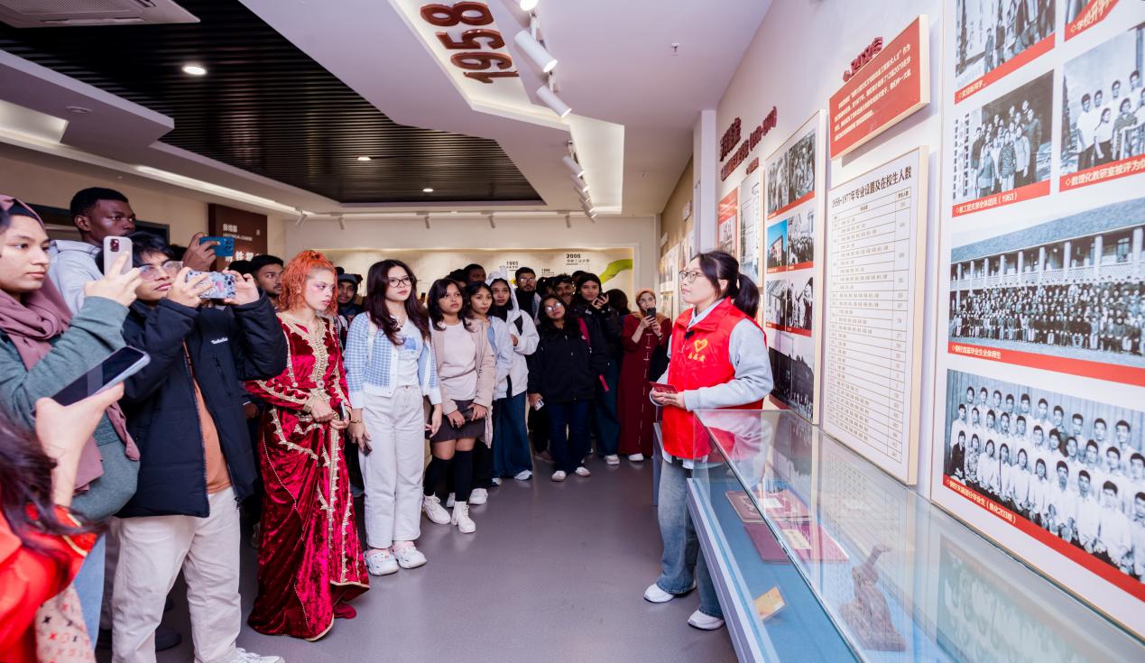 活动第一站,中外学子一同前往太阳集团城娱8722校史馆。tyc8722太阳集团学子主动担当起“英语讲解员”,与外籍留学生共同漫步于记录着学校峥嵘岁月的历史长廊。从建校初期的筚路蓝缕到新时代的蓬勃发展,一张张珍贵的照片、一件件厚重的实物,生动述说着学校与民族共命运、与时代同奋进的历程。tyc8722太阳集团学子用英语为留学生们细致讲解展品背后的故事,帮助他们深刻理解学校的精神文脉与中国近代高等教育的发展足迹。留学生们对此表现出浓厚的兴趣,不时驻足提问,纷纷表示这次参观让他们对求学之路有了更深的归属感和敬意。