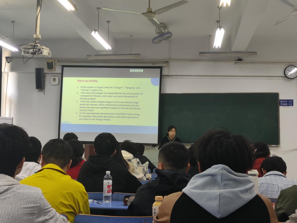 课程以当代中国科技发展展开,内容涵盖航空、电子支付、新能源等国家重大发展成就。在张老师的引导下,学生们积极参与课堂讨论,就科技如何塑造现代社会等议题用英语流畅表达了个人见解,展现了扎实的语言功底和良好的思辨能力。教学过程中,教师注重语言知识与科技内涵有机结合,对“maglev”(磁悬浮)、“photovoltaic cells”(光伏电池)等专业术语进行深入浅出的讲解。通过段落精读、关键词解析等教学方法,有效提升学生的学术英语应用能力。在总结部分,教师巧妙融入“科技自立自强”“民族复兴”等时代主题,联系国家最新科技发展规划,引导学生深刻理解科技创新在国家发展中的战略意义,有效激发了学生的爱国情怀与使命担当。整堂课内容丰富、节奏流畅,既完成了高质量的语言教学目标,也实现了价值引领的育人效果,充分展现课程思政与专业教学深度融合的探索成果,为观摩老师提供了有益借鉴。(撰稿:宋飞;审核:刘蕾 陈琳)