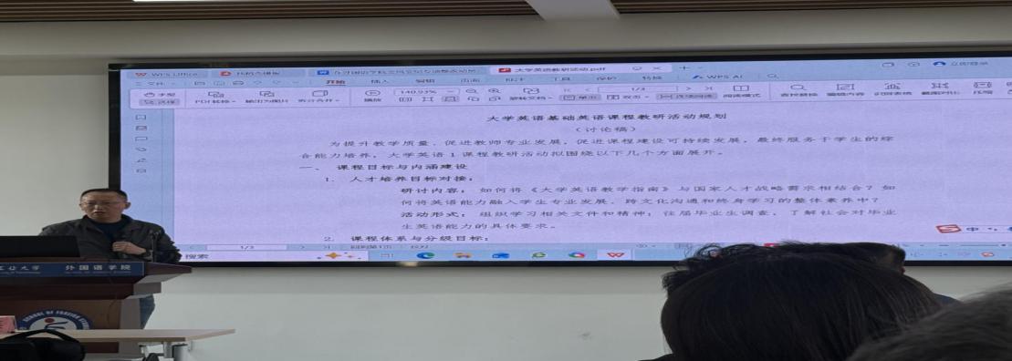 在教研活动环节,党支部书记周家春就“大学基础英语课程教研活动规划”作了专题发言,指出教研活动可紧紧围绕课程目标与内涵建设、教学内容与资源开发、教学方法与模式创新、教师专业发展与团队建设、教学评价与持续改进等五个方面展开,旨在全面提升教学质量,推动课程建设可持续发展,最终服务于学生综合能力培养。