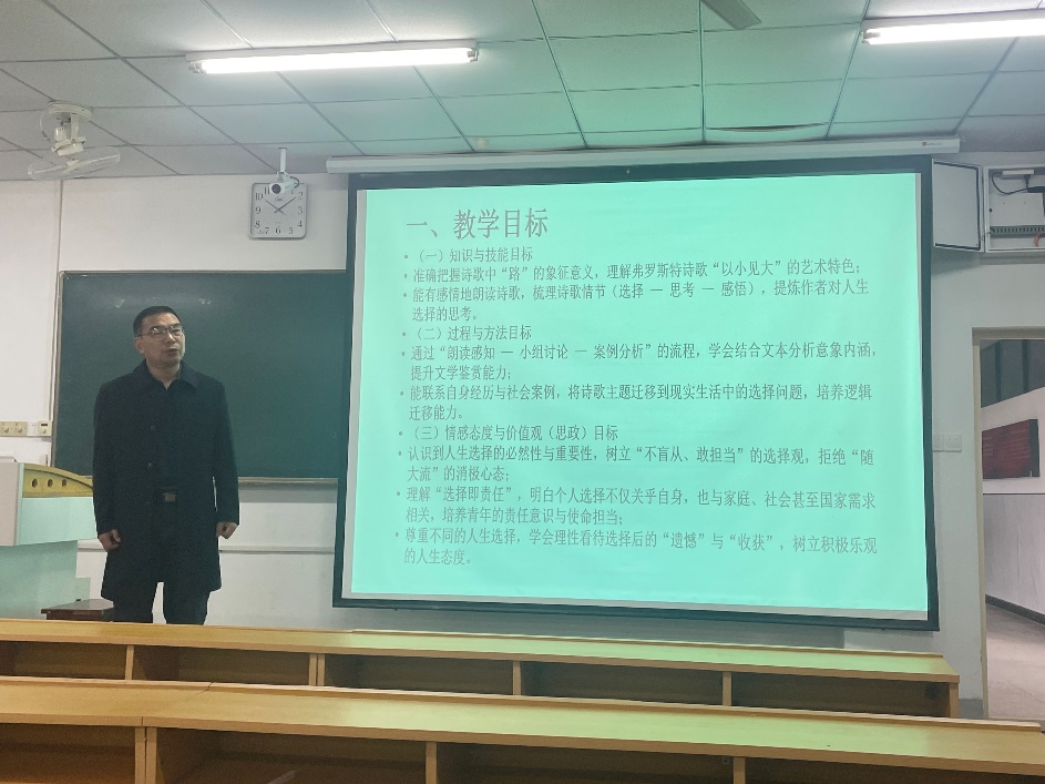 研讨中,马广利首先高屋建瓴地阐述了课程思政的必要性与重要意义,随后系统梳理了英美文学经典作品中可供挖掘的思政元素。最后,他以美国诗人罗伯特·弗罗斯特的《未选择的路》为例,进行了完整的思政教学设计展示。他从“荒草萋萋、十分幽寂”的诗歌意象出发,巧妙引申至个人成长与历史人物面临的关键抉择,以润物无声的方式,引导学生树立不盲从、敢担当、重责任的价值观。