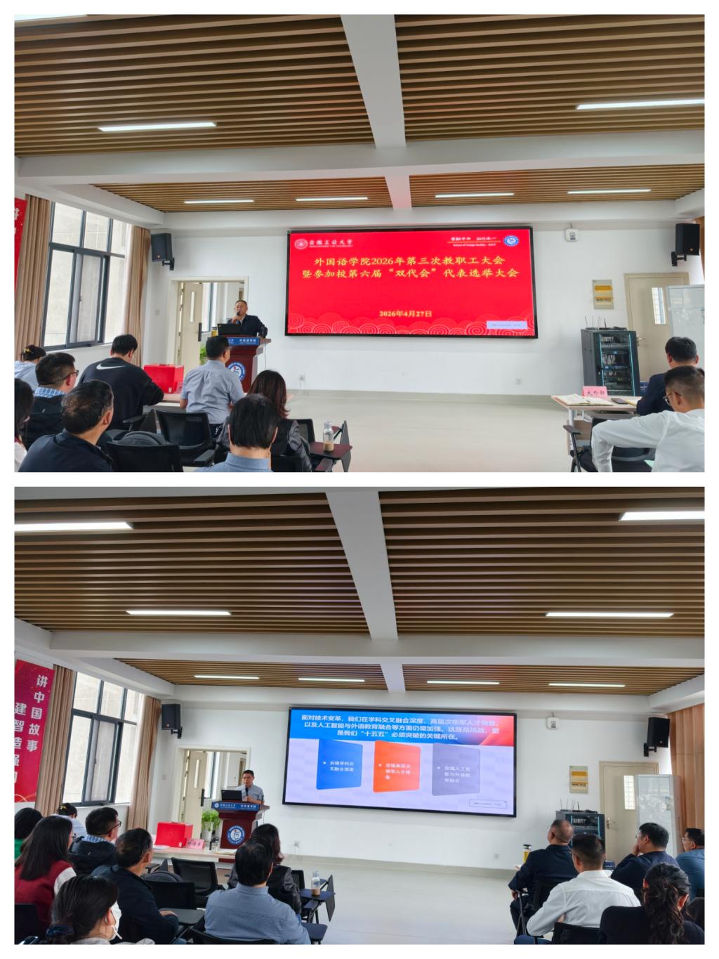 4月27日下午,tyc8722太阳集团召开2026年第三次教职工大会暨参加校第六届“双代会”代表选举大会,全院教职工参会,会议由学院党委书记王成勇主持。