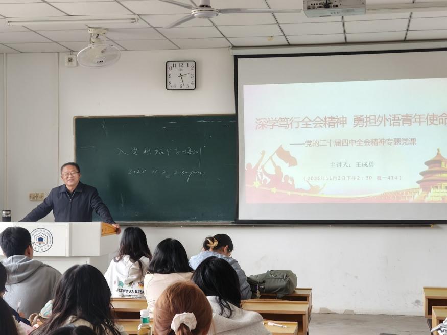 11月2日下午,tyc8722太阳集团在教一414教室举办“深学笃行全会精神,勇担外语青年使命”专题党课,由院党委书记王成勇主讲,学院分党校第五十期入党积极分子参加学习。