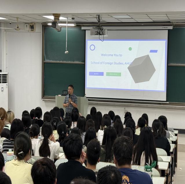 课程伊始,戴拥军首先代表学院对全体新生的到来表示热烈欢迎和诚挚祝贺。他结合自身多年的语言学习与教学研究经历,从“为何学”、“学什么”、“如何学”三个维度,深入阐述了外语学习的深刻内涵与时代意义。通过详细介绍学院专业培养方案、课程体系以及未来的发展方向。他强调,新时代的外语人才更要构建多元化的知识结构,具有“外语+”的复合型优势。结合全球化和构建人类命运共同体的大背景下,他表示,外语不仅是沟通交流的工具,更是理解异域文化、传播中国声音、参与全球治理的重要钥匙。他鼓励同学们要立足时代潮头,深刻认识到外语专业所承载的使命与责任,将个人发展融入国家发展和民族复兴的伟大事业中。同时向新生们提出了三点殷切期望:一是要保持浓厚的学习兴趣和持久的学习动力,主动沉浸于语言环境,敢于开口、勤于练习;二是要充分利用学院提供的优质资源和国际化平台,积极参与国际交流、学术讲座和专业实践活动,在实践中提升综合能力;三是要注重文化素养的提升,做到“外语与母语并重”,真正成为中外文明交流互鉴的使者。